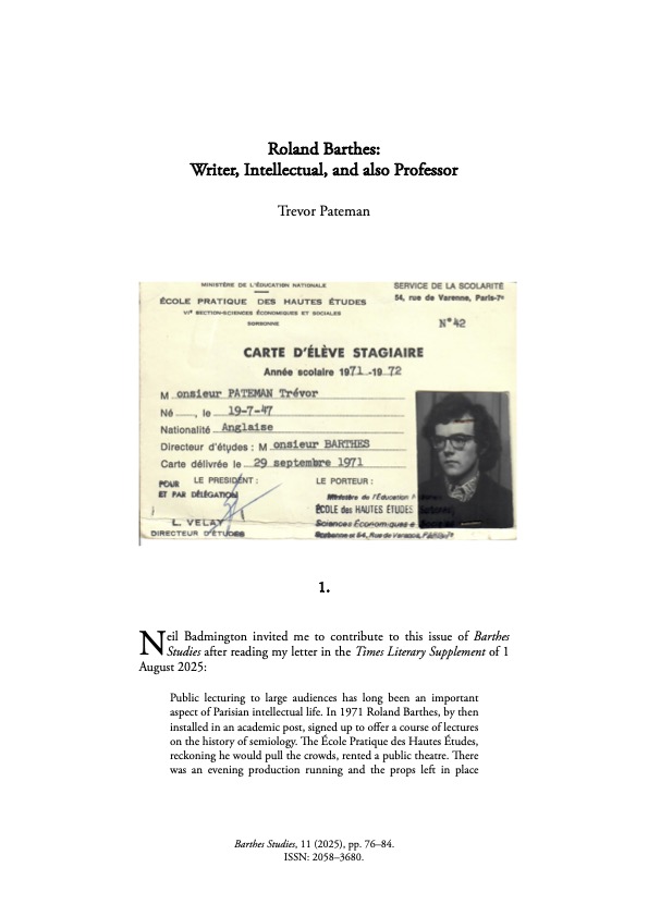 He also mentions attending classes by other French academics, including Derrida, Lacan and Lévi-Strauss, and Jakobson lecturing at the College de France, which I write about here. What a time to be in Paris! The short piece also includes images of a letter and a postcard from Barthes.