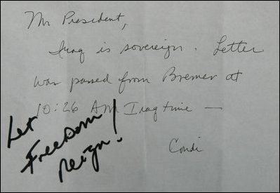 Iraqi Prime Minister Nouri al-Maliki said that “Iraq today is sovereign and independent.” He continued: “With the execution of the troop pullout, our relations with the United States have entered a new stage between two equal, sovereign countries.” But think back over six years to June 28, 2004, when Paul Bremer handed over a note to an Iraqi judge and left the country in a helicopter. Condoleezza Rice passed a note to President Bush saying…
