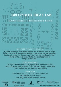 The inaugural Gregynog Ideas Lab, a Summer School in PostInternational Politics, will take place 9-14 July, 2012. The Summer School will provide a unique opportunity for graduate students and academics to return to key texts and thinkers from critical, postcolonial, feminist, post-structural and psychoanalytic traditions, to re-examine their work and how it has been employed in international politics, and to ask whether the radical potential of this work is in danger of being lost.