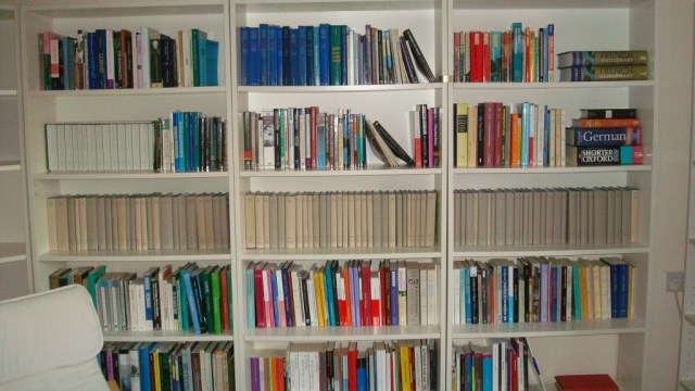 Many of my books are at work in the office. though I do have a lot at home. I’ve talked about the system for books before, and the new place is going to be similar. I think I will move a lot of the history of philosophy and history of political thought books from the office to home, and because the study here is smaller than the one in the old place I will only have academic books in it. But this place has a spare room, which the last didn’t, and that will be shelved with novels, cds, dvds etc.