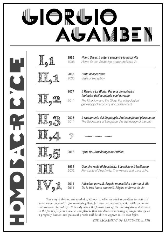 Any guesses on what II, 4 and IV, 2 will amount to? Agamben’s latest research presented in seminars concerns an «archeology of command and will» (Paris 8, EGS), and «the use of the body» (Paris 8).