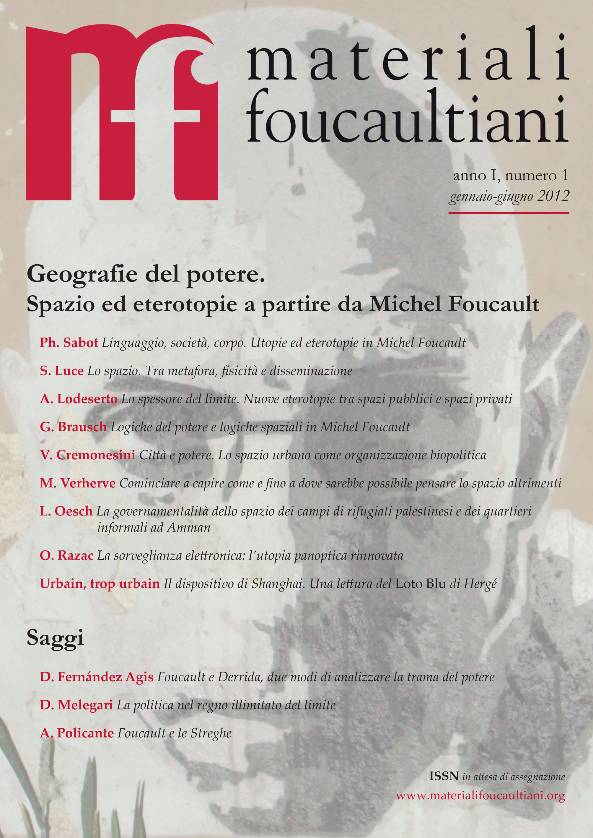 Italian journal materiali foucaultiani is now published. The issue has a theme section on ‘Geographies of power: space and heterotopias’. A pdf is available here; you can view it in issuu here. French and English texts are promised for the future. Thanks to Clare O’Farrell’s Foucault News blog for the link.