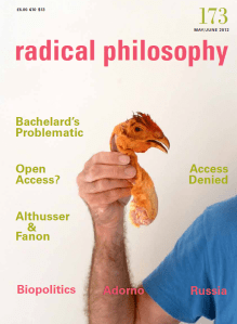 But why isn’t Radical Philosophy freely available in its entirety to all on the web? Because we would not then be able to produce it as a hard copy magazine, since we would not generate sufficient income from institutional subscriptions. Much of what is intellectually and culturally distinctive about Radical Philosophy,we believe, is connected to its format and low-priced availability in bookshops and to individual subscribers. However, we are also exploring the possibilities of new formats.