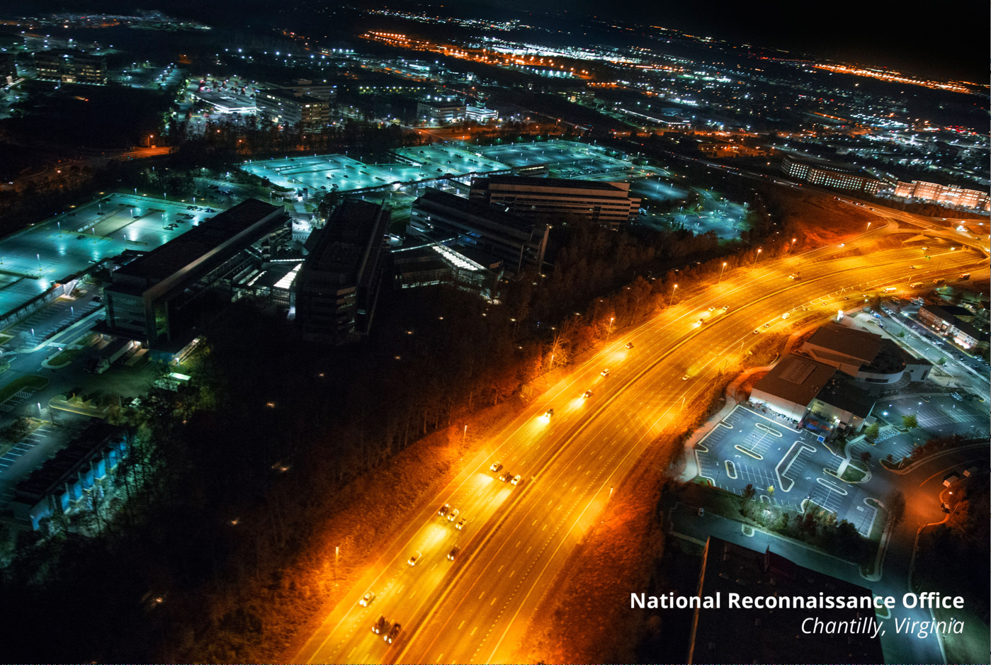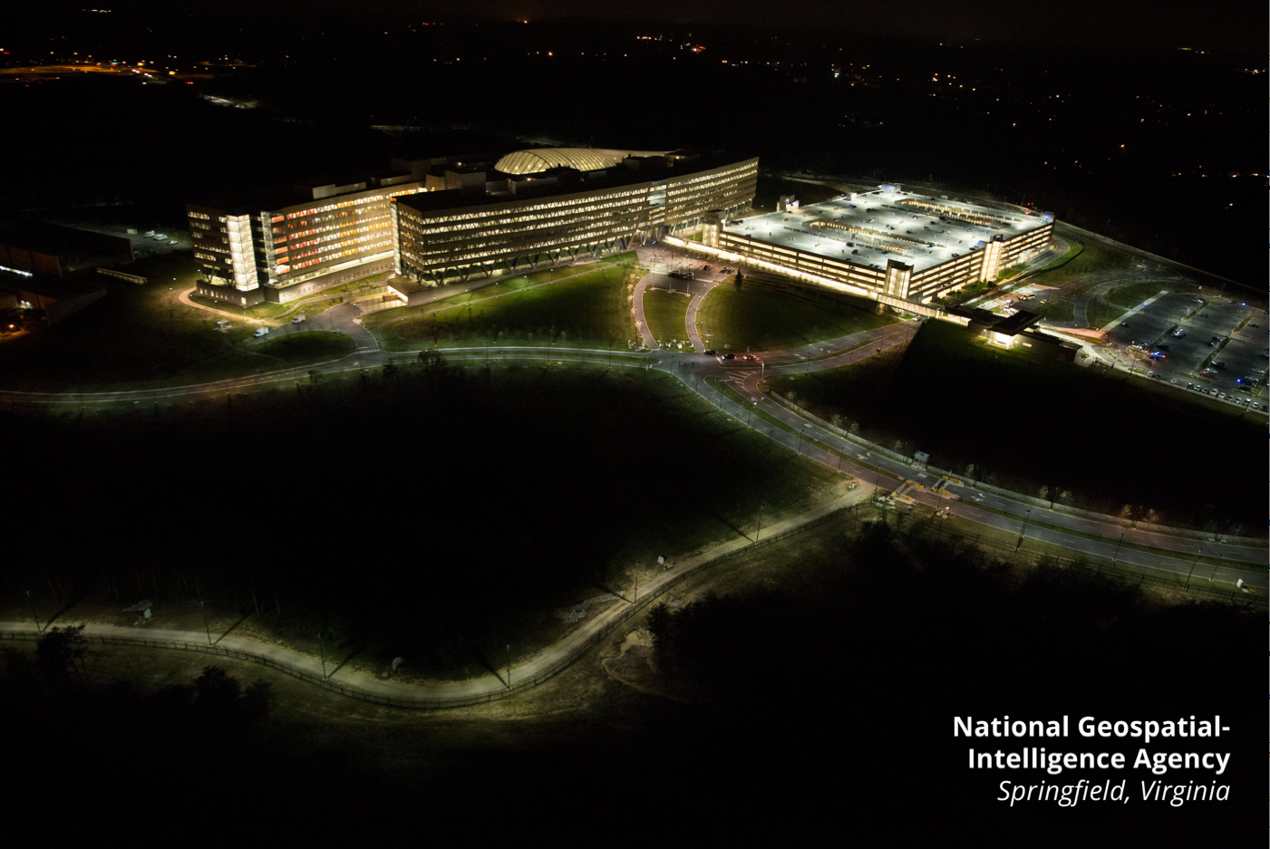 Traver Paglen has released these birds-eye photos of the NSA (National Security Agency, the “signals” intelligence organization, $10.8 billion dollar budget), the NRO (National Reconnaissance Office – in control of U.S. satellites, $10.3 billion dollar budget), and the NGA (National Geospatial-Intelligence Agency – the mapping [GIS] agency, $4.9 billion dollar budget). As Paglen notes, much of the discussion of the U.S.’ surveillance state lacks a physical, or spatial component. These nightime images, taken from a helicopter, are reminders of the enormous footprint that collecting planetary-wide data actually makes in the ground. Here’s the images, which can be freely distributed.