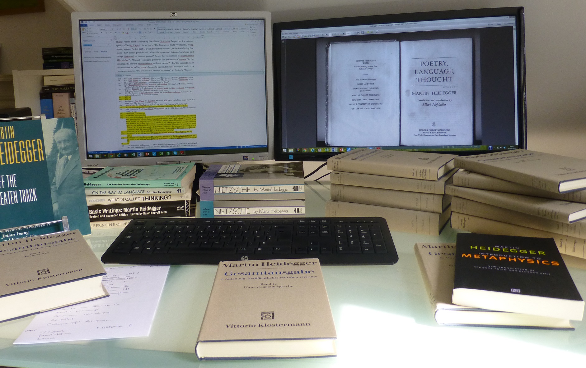 Once I’ve located the German in the modern edition, then I find the English translation. Almost all of the texts referenced do exist in an English translation, and I do have most of these. But while some books are translated entire – Holzwege (Off the Beaten Path) and Wegmarken (Pathmarks), for instance – others have their contents scattered through multiple collections – Vorträge und Aufsätze ends up in five or six different English books (a new translation of this is overdue). The English Nietzsche does not include all of the German, but adds a related essay. In long essays with no or few section divisions, finding a specific passage can take a while.