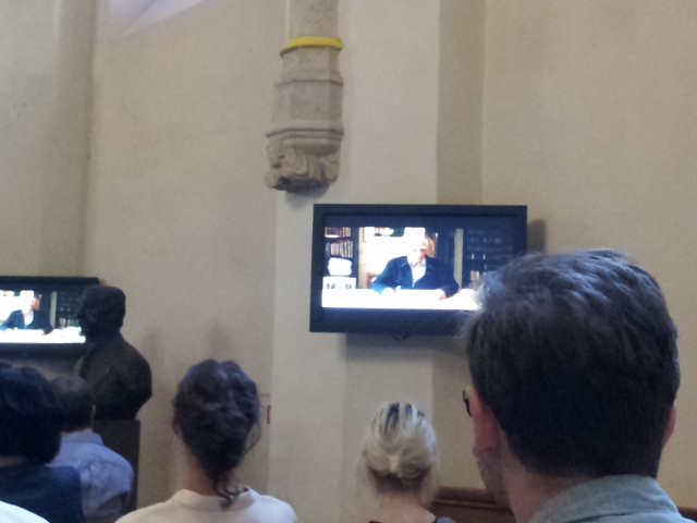 There was a great sadness this morning at the conference that Michel Serres’ health has not permitted him to travel to Utrecht in person, but also a deep thankfulness and appreciation that, despite his failing health, he had taken the time to pre-record his address. The discussion that followed his paper (recorded at his house in Vincennes and played to the conference on a series of television screens around the meeting room in St Martin’s Cathedral, pictured below) certainly lacked for nothing in terms of liveliness.
