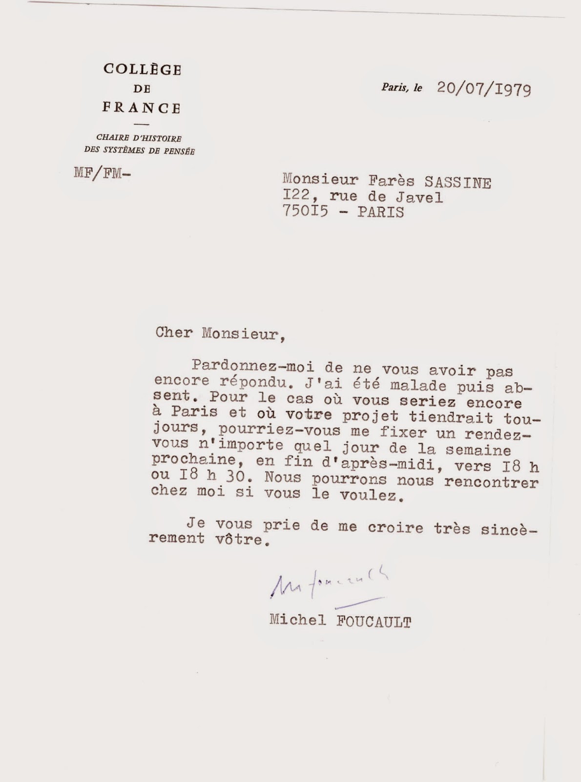 I’ve stumbled upon an interview with Foucault from this era that has up until recently remained completely uncommented by Foucault scholarship, unreferenced even in Afary-Anderson [Foucault and the Iranian Revolution – SE]. I have no doubt that you will find it interesting. The interview was conducted in August ’79 with Farès Sassine from the Paris paper An-Nahar al-`Arabi wa‘d-Duwali, in which extracts were published in ’79. translated into Arabic from the French. The original article, in Arabic, can be found here. It wasn’t until last year, however, that a full transcription of the interview in French was published in the somewhat obscure Revue Rodéo (no. 2) with an accompanying piece by Farès Sassine himself. This, also, alas, has been impossible for me to track down, but luckily, just this August, 35 years after the interview, Mr. Sassine posted the transcript on his blog along with some editorial remarks.