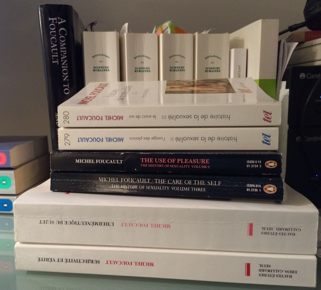 I then go onto a reading of volumes II and III as actually published. I read these first twenty years ago, in the first year of my PhD, and have returned to them periodically since. I confess I previously found them Foucault’s least interesting books, but reading them again, having worked through all the lecture courses and other materials in chronological order, was something of a revelation. They are so dense, deceptively so given the very different writing style to some of Foucault’s earlier books. It’s not so far away from reading Heidegger’s Being and Time in the light of his lecture courses on Aristotle in the 1920s –sections, paragraphs and even lines in the books are the distillation of extensive lecture material. But I’m struck again at how Foucault’s lectures, while preparatory to the books, never map onto them straight-forwardly. Themes are reconfigured, new material is introduced that was never trialled in lectures, and crucial topics in lectures disappear. Volume II especially seems to have had very little exposure to a public audience. Volume III is much more reliant on lectures, especially the Subjectivité et vérité course. Perhaps the chapter I enjoyed the most was ‘The Political Game’ from Part III of Volume III, which despite my interest in politics I’d never really given much thought before. But the account there is very intriguing, especially in terms of Foucault’s account of power.
