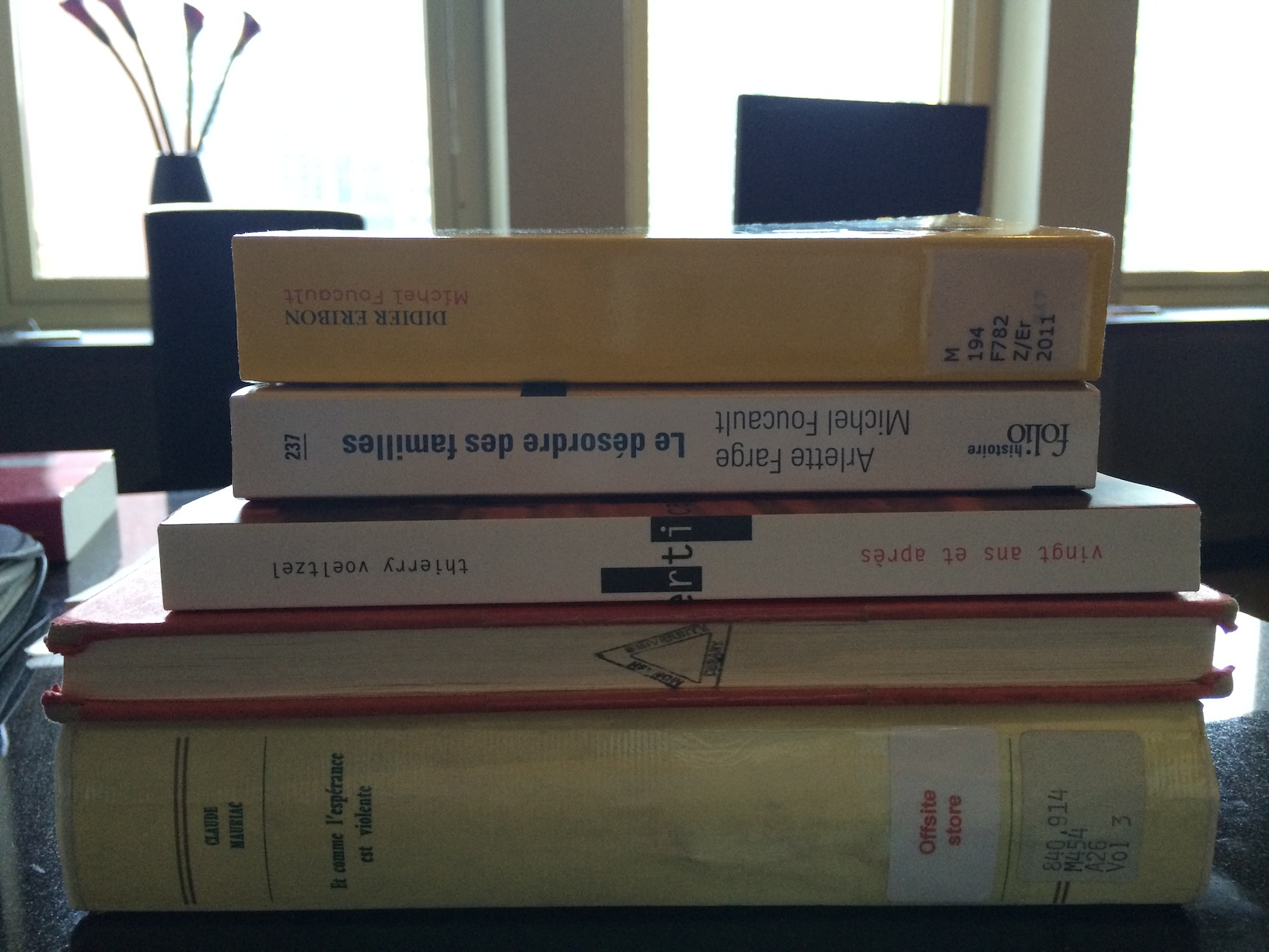 My book is very much about Foucault’s work and not his life, though in terms of his activism and working practices that line is blurred; and largely about his work rather than the secondary literature. The books I’m reading or rereading at this stage are mainly ones that might tell me something that I couldn’t find out from reading Foucault himself. In that respect it’s often the information the biographers got from their interviews that has been most helpful. Eribon’s has a few interesting pieces of documentary evidence, and I decided I need to check all the quotes from that back to the original French version. I have a copy of the second edition back in England (this edition was the basis for the English translation), but there is a new French third edition from 2011. I’ve checked all the quotations to that new edition – there are some parts revised and lots of additions. It also includes some interesting documentary evidence in appendices, some of which was familiar – Foucault’s candidacy presentation to the Collège de France and Canguilhem’s report on his doctoral thesis; and some of which wasn’t – notably, the Collège de France documents for the creation of his chair and his election to it. I will make time to read the entire new edition.