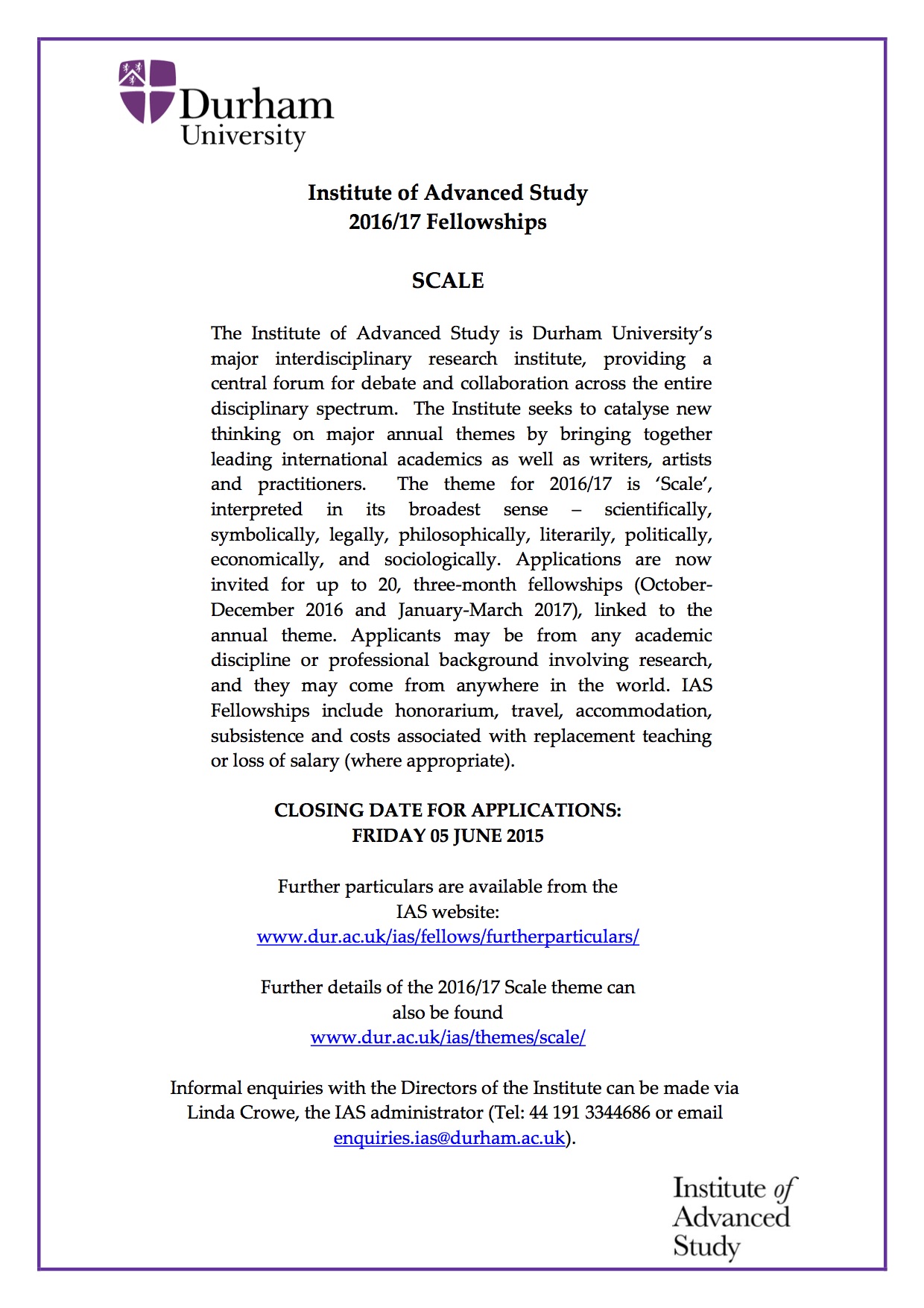 Durham’s Institute of Advanced Study has advertised the 2016-17 fellowships on its Scale theme with a closing date of 5 June 2015 – more details here.