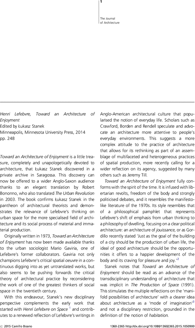 Camilla Boano reviews Lefebvre’s Towards an Architecture of Enjoyment in The Journal of Architecture (requires subscription).