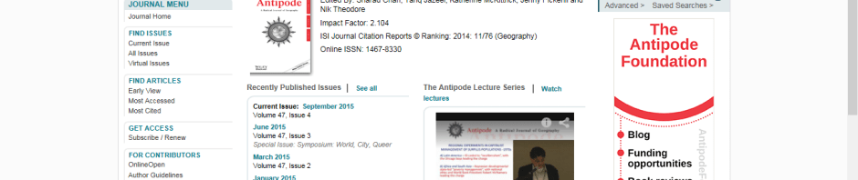 It’s not quite the middle of August and the September issue of Antipode is out now! Antipode 47(4) really showcases critical geography at its very best: timely topics, engaged research, engaging writing…
