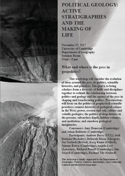 This workshop will consider the evolution of ideas around the geos, its politics, scientific histories, and practices. The goal is to bring scholars from a diversity of fields and disciplines together to rethink the relationship between politics and geology and the agency of the geos in shaping and transforming politics. Presentations will focus on the politics of geophysical scientific practices; counter-histories of geological science in the West; power, erosion and soil; culture and volatile geologies; the politics of deep-futures in the present; subsurface depth, hidden-volumes, and mediation; and amodern geological imaginaries.