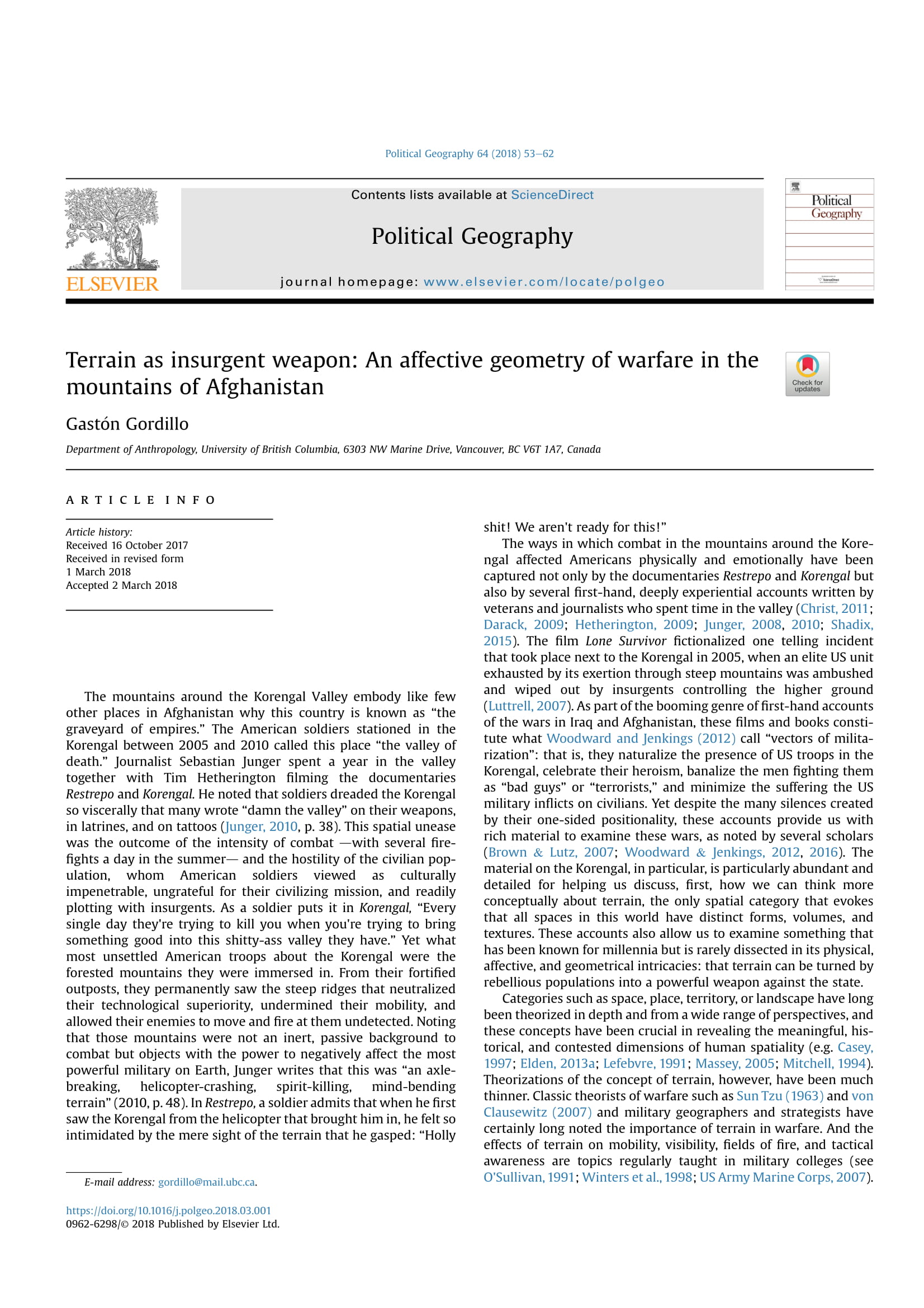Gastón Gordillo, “Terrain as insurgent weapon: An affective geometry of warfare in the mountains of Afghanistan“, Political Geography (requires subscription – first page available to preview or click on the image). No abstract, so I’ve taken this summary from Derek Gregory’s Geographical Imaginations site.