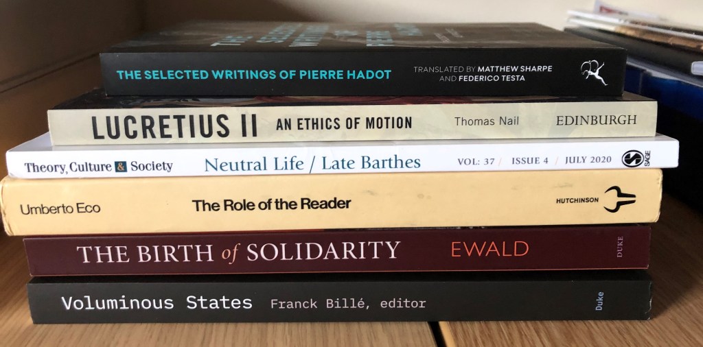Some books waiting for me in the office – The Selected Writings of Pierre Hadot, Thomas Nail, Lucretius II: An Ethics of Motion, the Theory, Culture & Society special issue on Neutral Life/Late Barthes, Umberto Eco, The Role of the Reader, François Ewald, The Birth of Solidarity and Franck Billé’s collection Voluminous States.