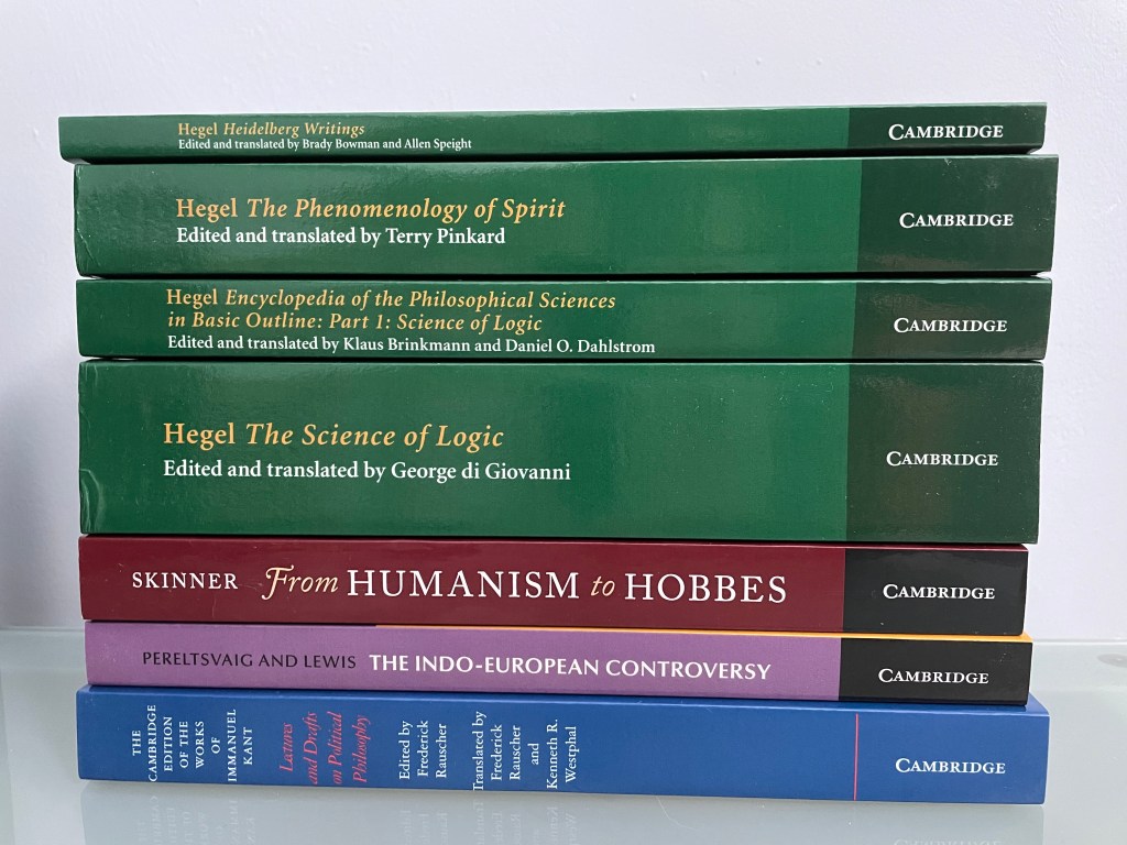 Some books received in recompense for review work for Cambridge University Press: The first four volumes of the Cambridge Hegel Translations, Quentin Skinner’s From Humanism to Hobbes: Studies in Rhetoric and Politics, The Indo-European Controversy, and Kant’s Lectures and Drafts on Political Philosophy.