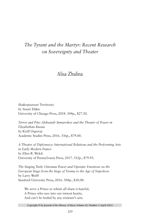 Alisa Zhulina, ‘The Tyrant and the Martyr: Recent Research on Sovereignty and Theater‘ – review essay in Journal of the History of Ideas (requires subscription).