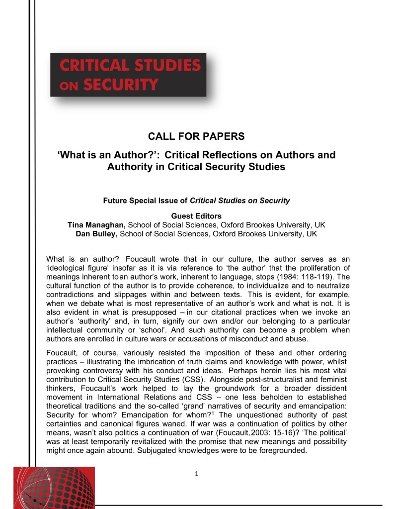 1 Response to CFP: ‘What is an Author?’: Critical Reflections on Authors and Authority in Critical Security Studies