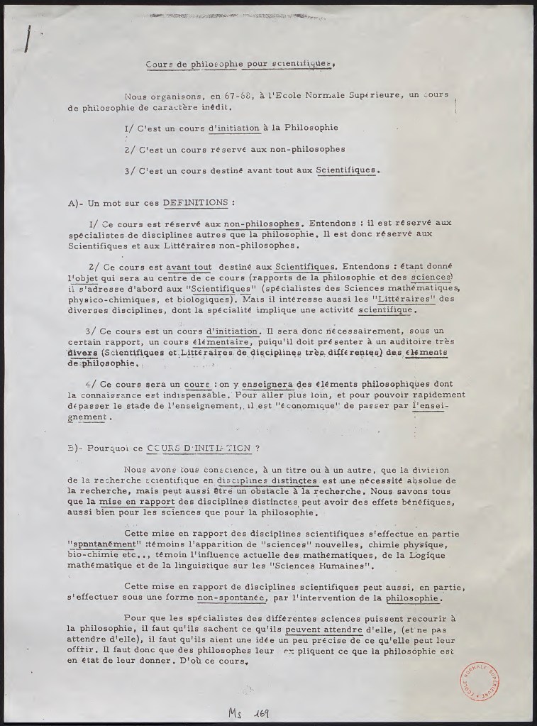 Between 1967 and 1968 Louis Althusser and some of his students delivered a course at the ENS pitched as philosophy for scientists or non-philosophers.