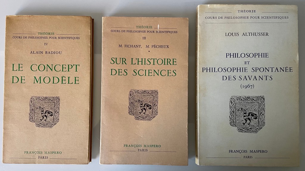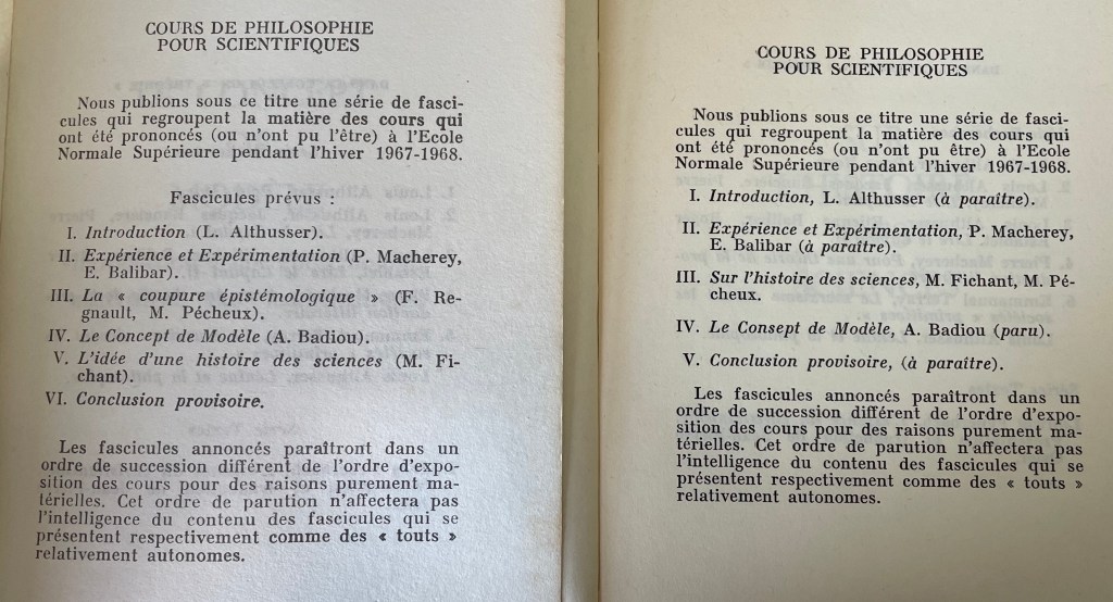 Between Badiou’s book and the Fichant/Pécheux one the structure of the series changed, with François Regnault withdrawing his contribution, and the third and fifth volumes being merged. Of the second plan, only Althusser’s Introduction was published, as Philosophie et philosophie spontanée des savants (1967), but only in 1974; translated in Philosophy and the Spontaneous Philosophy of the Scientists. The French text is, I think, out of print, but available on Gallica.