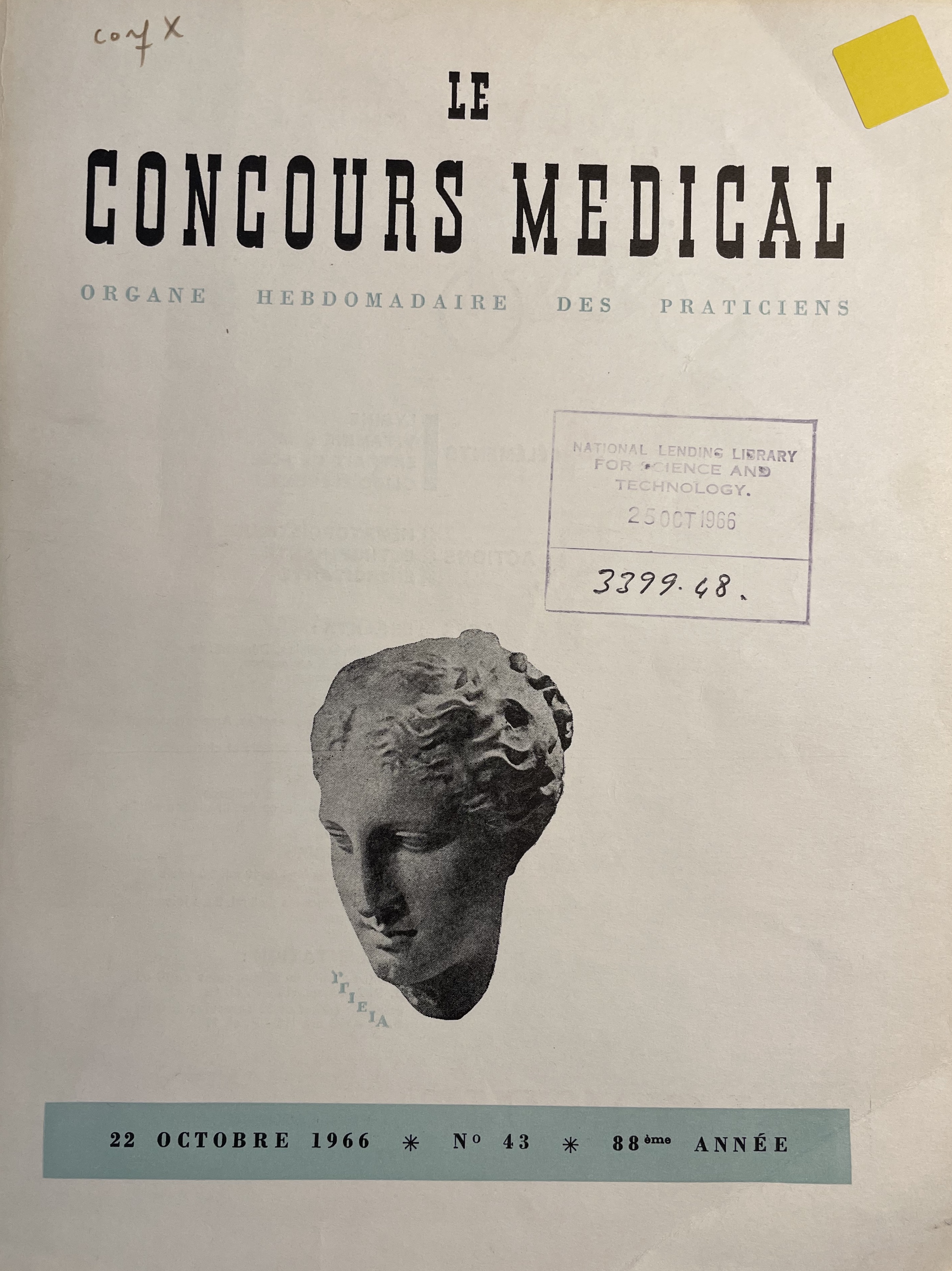 Le Concours médicale is a professional medical journal, having the subtitle “Organe hebdomadaire des praticiens [weekly journal for practitioners]”. (It has recently been relaunched as Concours Pluripro) The previous issue mentioned has a collective piece entitled “Colloque sur… La nature de la pensée médicale (I)”, Le Concours médicale, No 42, 15 Octobre 1966, 6101-12.