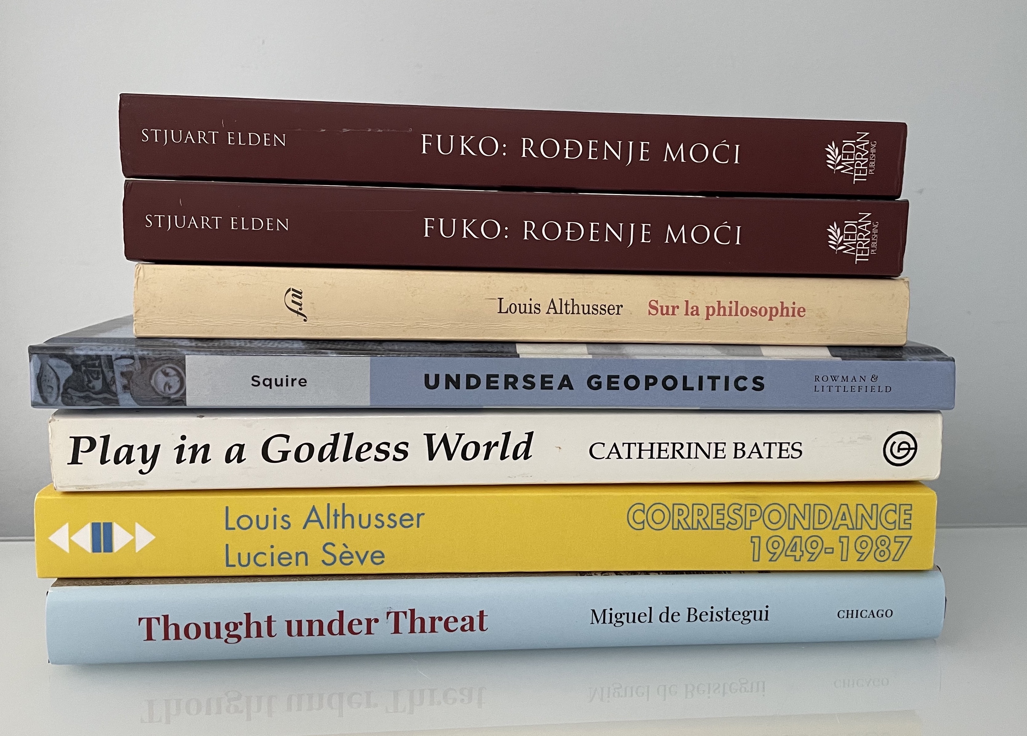 Stjuart Elden: Fuko: Rođenje moći (the Serbian translation of Foucault: The Birth of Power), two older Althusser books and one by Catherine Bates, Rachael Squire’s fascinating Undersea Geopolitics: Sealab, Science, and the Cold War, which I endorsed, and Miguel de Beistegui, Thought under Threat: On Superstition, Spite, and Stupidity, sent by University of Chicago Press.