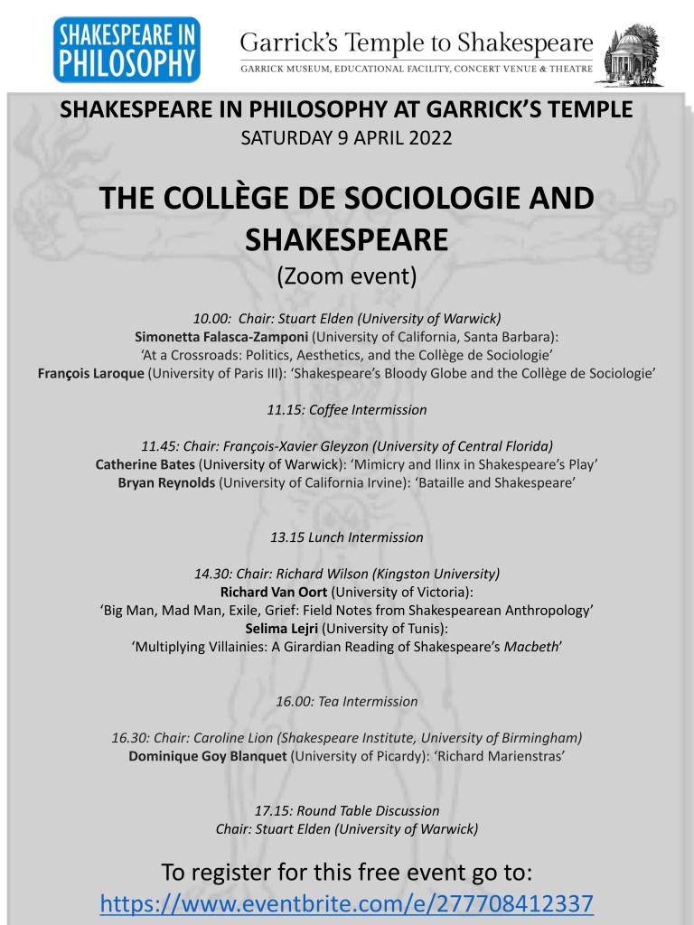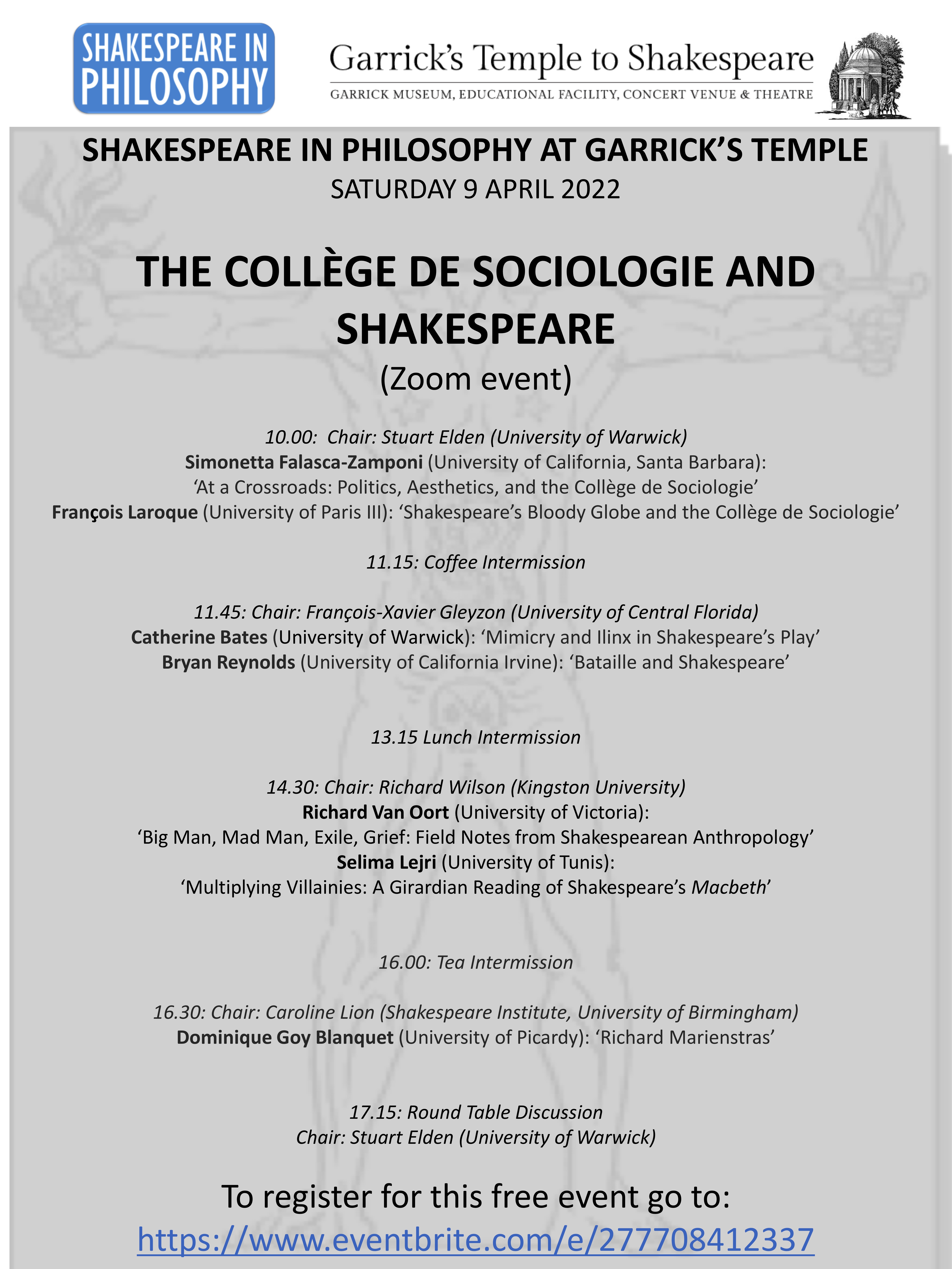 9 April 2022, 10am-6pm (UK) – The Collège de Sociologie and Shakespeare, Garrick’s Temple to Shakespeare, online event.