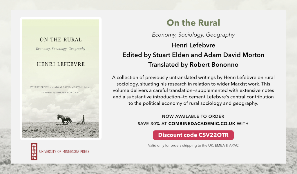 Henri Lefebvre, On the Rural: Economy, Sociology and Geography – University of Minnesota Press, 2022. Edited by Stuart Elden and Adam David Morton, translated by Robert Bononno, with one essay each by Matthew Dennis and Sîan Rosa Hunter Dodsworth.