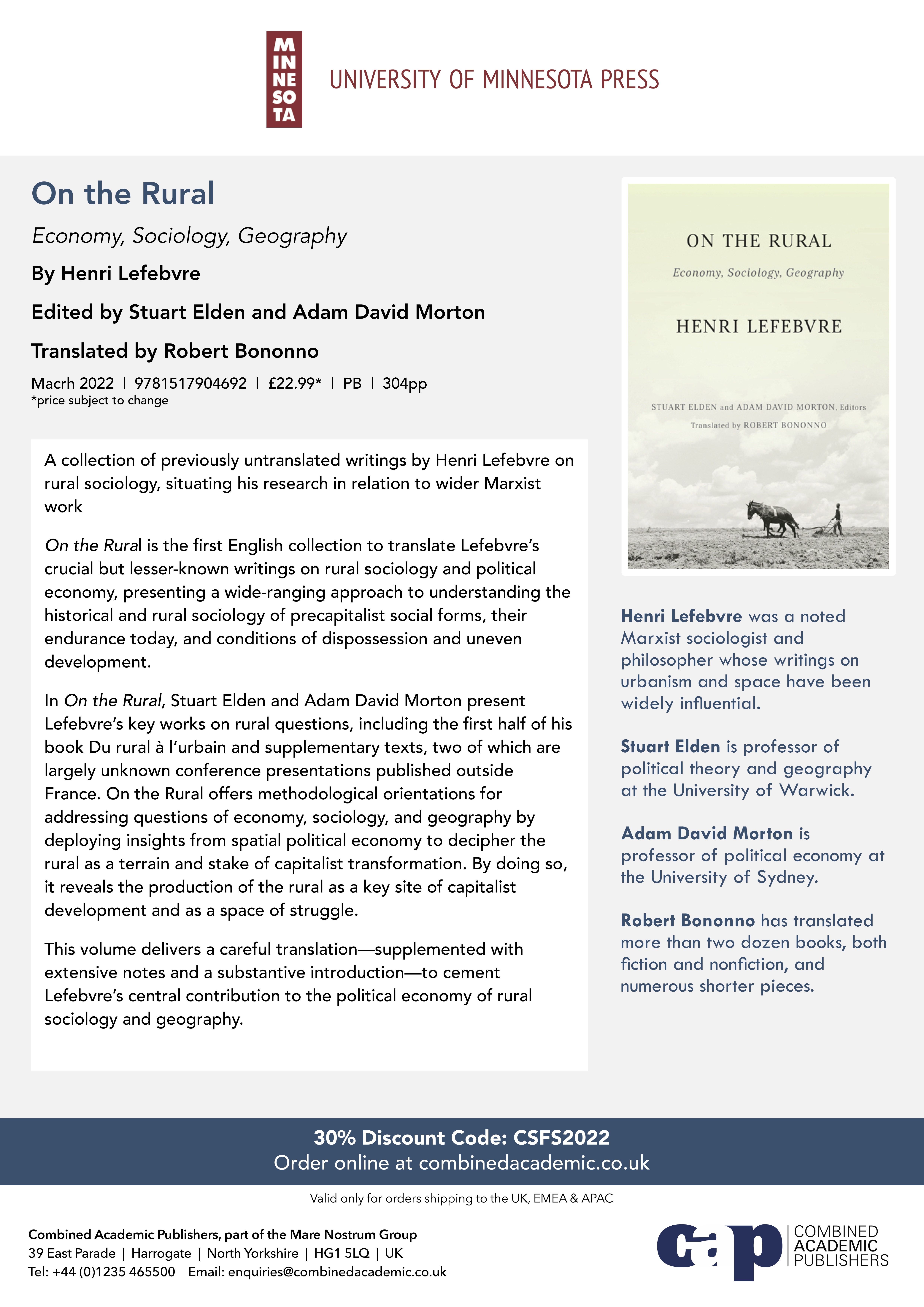 Henri Lefebvre, On the Rural: Economy, Sociology and Geography – University of Minnesota Press, 2022. Edited by Stuart Elden and Adam David Morton, translated by Robert Bononno, with one essay each by Matthew Dennis and Sîan Rosa Hunter Dodsworth.