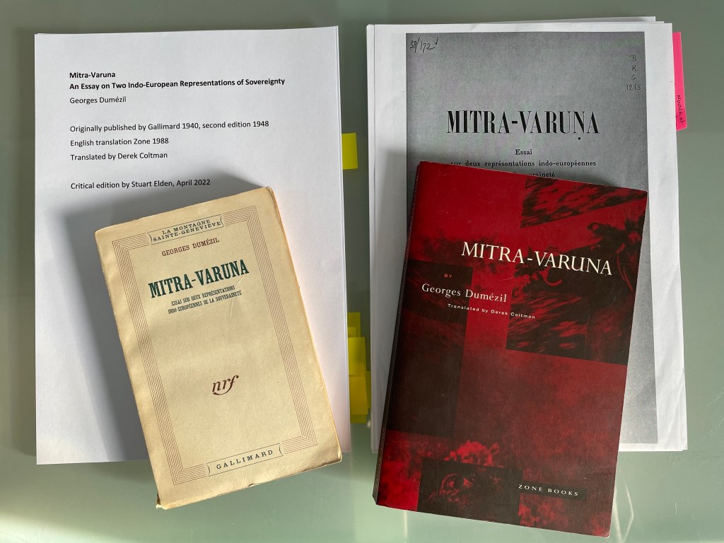 As I’ve mentioned before, as part of the next big project, I am working on a new English edition of Georges Dumézil’s book Mitra-Varuna: An Essay of Two Indo-European Representations of Sovereignty. The book was published in 1940, and in a second edition in 1948. It was translated by Derek Coltman for Zone books in 1988. It’s been long out of print, though available online, and second-hand copies can be found, though can be rather expensive. I initially approached Zone, but they decided against doing a new edition, so I contacted Hau Books, who have done some reeditions of classic texts, including by Marcel Mauss and Émile Benveniste – the former a teacher and the latter a close colleague of Dumézil. They were the obvious fit, were enthusiastic about the idea and bought the rights.