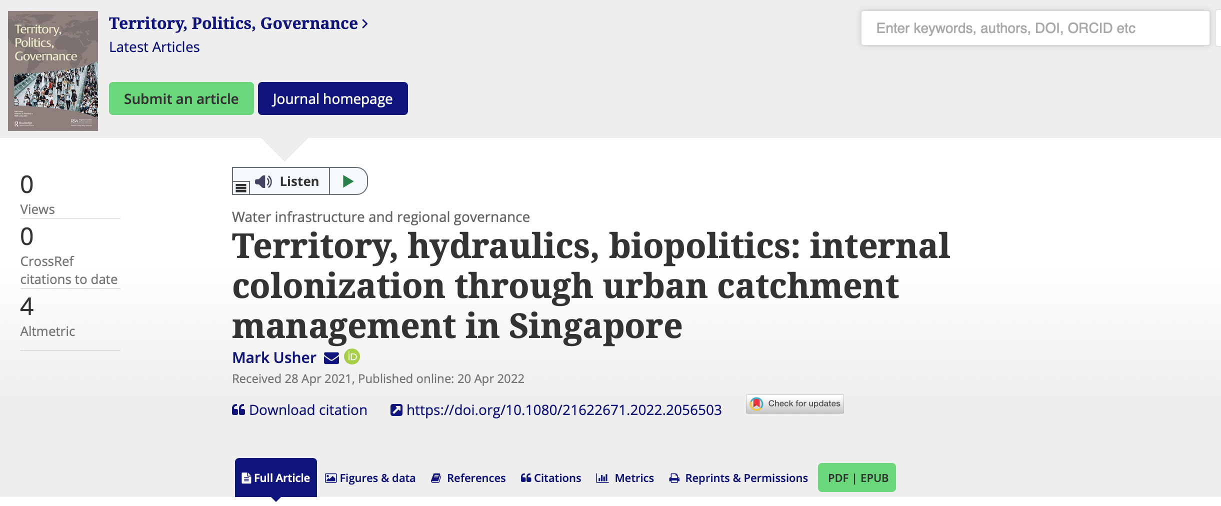 Mark Usher, Territory, hydraulics, biopolitics: internal colonization through urban catchment management in Singapore – Territory, Politics, Governance, April 2022