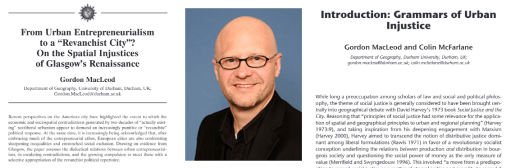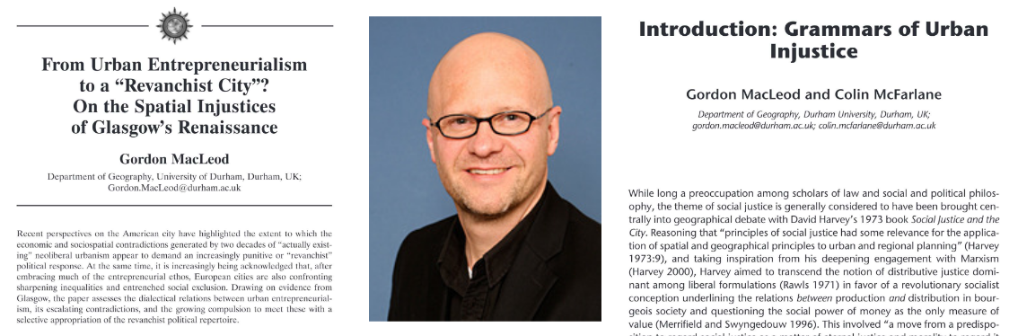 The Editorial Collective and the broader Antipode community have been deeply saddened to learn of the untimely death of Gordon MacLeod. Gordon was a singular voice in critical geography who was a good friend to Antipode and responsible for publishing a number of key articles in the journal. In tribute we have made his contributions to the journal free to view. They demonstrate both key aspects of his contribution to the discipline and his broader political engagement and energy.