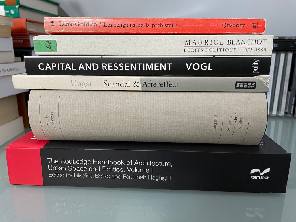 Some second-hand books connected in part to the ongoing research on Indo-European though in France, the latest volume of the Heidegger Gesamtausgabe and copies of Joseph Vogl, Capital and Ressentiment: A Short History of the Present and Nikolina Bobic and Farzaneh Haghighi (eds.), The Routledge Handbook of Architecture, Urban Space and Politics, Volume I: Violence, Spectacle and Data – kindly sent by the publisher and editors.