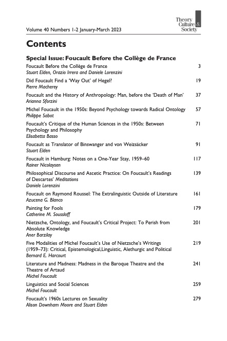 ‘Foucault before the Collège de France’ – theme issue of Theory, Culture & Society, coming soon, edited by Stuart Elden, Orazio Irrera and Daniele Lorenzini