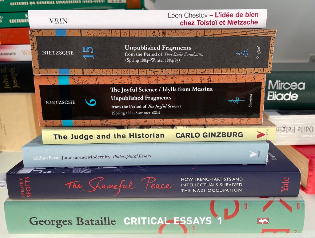 Some recently bought books – Léon Chestov’s L’idée de bien chez Tolstoï et Nietzsche (Bataille was one of the translators); the two most recent volumes of the Stanford Nietzsche translations; Carlo Ginzburg’s The Judge and the Historian; Gillian Rose, Judaism and Modernity; Frederic Spotts, The Shameful Peace: How French Artists and Intellectuals Survived the Nazi Occupation and Georges Bataille, Critical Essays 1.