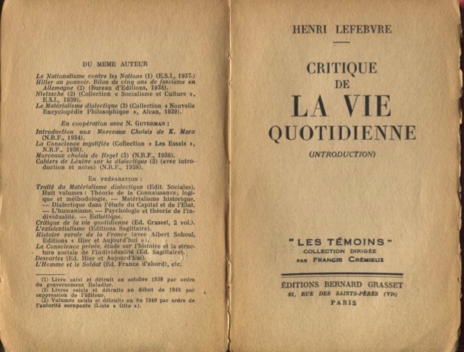 In looking further into this, though, I went back to the original edition of Critique de la vie quotidienne from 1946. On the page ‘Du même auteur’, Lefebvre lists his previous publications.
