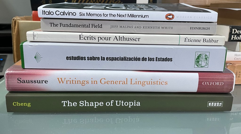 Some books bought or sent recently – Italo Calvino’s Six Memos for the Next Millennium, Jeff Malpas and Kenneth White, The Fundamental Field, Étienne Balibar’s Écrits pour Althusser, Carlos Salamanca Villamizar, Gabriela González and Francisco Astudillo (eds.), Estudios sobre la espacialización de los Estados: Políticas, prácticas, y representaciones, Saussure’s Writings in General Linguistics and Irene Cheng, The Shape of Utopia: The Architecture of Radical Reform in Nineteenth-Century America.