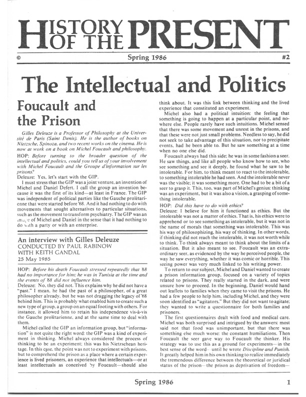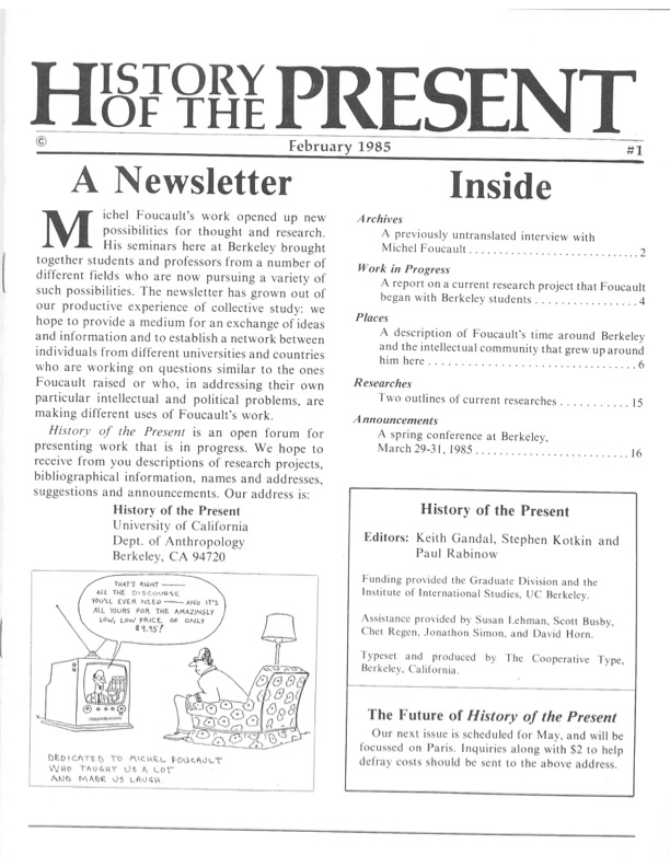 Quite a while ago I posted about History of the Present, the newsletter devoted to Foucault’s work published by Paul Rabinow and edited by him and other people at Berkeley. It used to be online via Rabinow’s Anthropos Lab. At the time I’d been looking for copies in libraries, and the online version took a little while to find, so I hoped others will find it helpful.