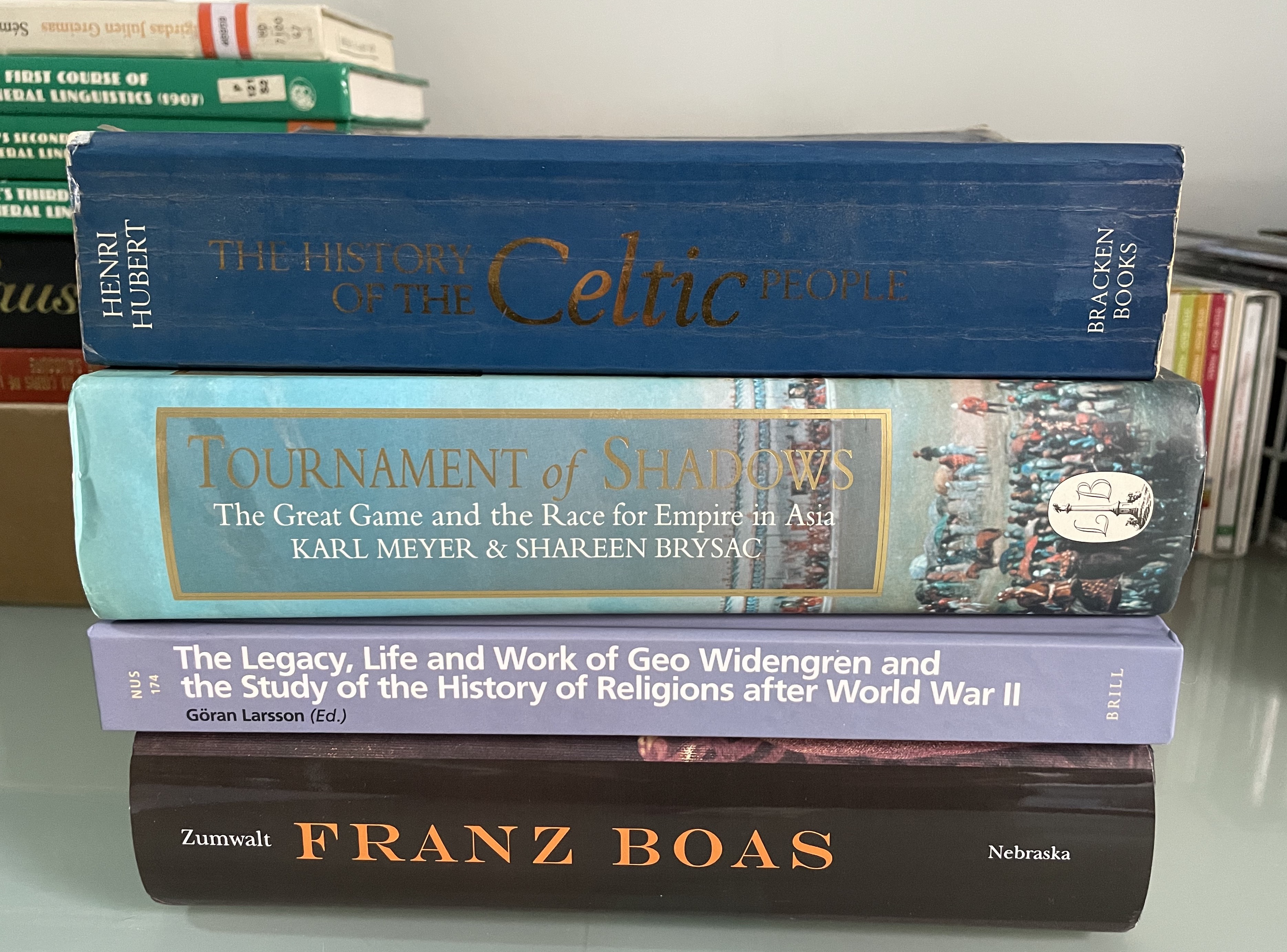 Henri Hubert’s History of the Celtic Peoples (which contains two of his French books in translation); Karl Meyer and Sharon Brysac, Tournament of Shadows: The Great Game and the Race for Empire in Asia; Gören Larsson (ed.), The Legacy, Life and Work of Geo Widengren and the Study of the History of Religions after World War II; and the second volume of Rosemary Lévy Zumwalt’s biography – Franz Boas: Shaping Anthropology and Fostering Social Justice.