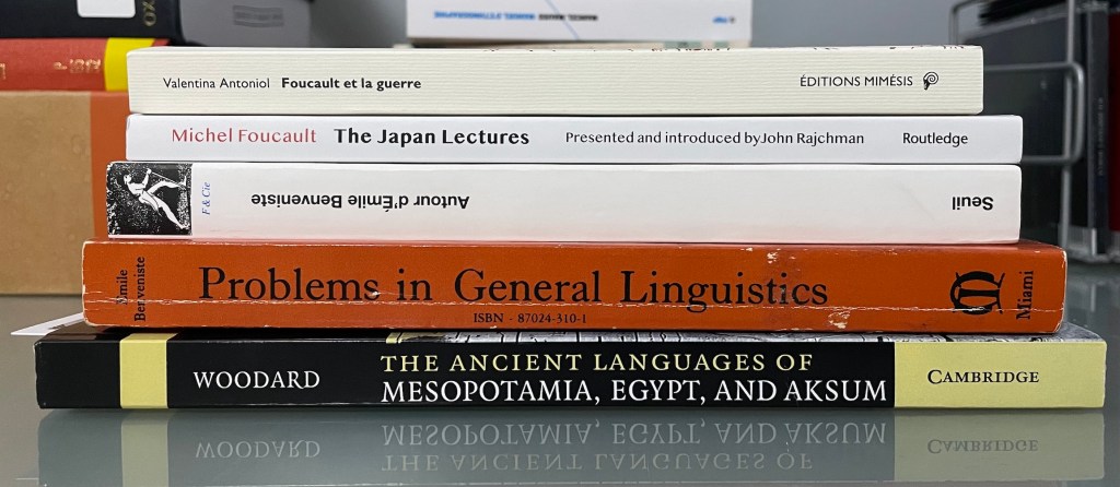 Valentina Antoniol, Foucault et la guerre: À partir de Schmitt, contre Schmitt; Michel Foucault, The Japan Lectures, edited by John Rajchman; and second-hand copies of Benveniste’s Problems in General Linguistics, Autour d’Émile Benveniste and Roger Woodard (ed.), The Ancient Languages of Mesopotamia, Egypt and Aksum. Valentina kindly sent me a copy of her book, and The Japan Lectures was sent by Routledge. The expanded edition of Benveniste’s Problems is still listed as forthcoming from Hau books, but it has been long delayed.