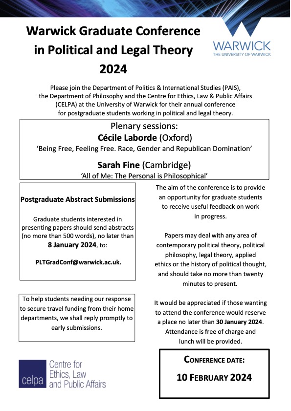 Please join the Department of Politics and International Studies (PAIS), the Department of Philosophy and the Centre for Ethics, Law and Public Affairs (CELPA) at the University of Warwick for their annual conference for postgraduate students working in political and legal theory.