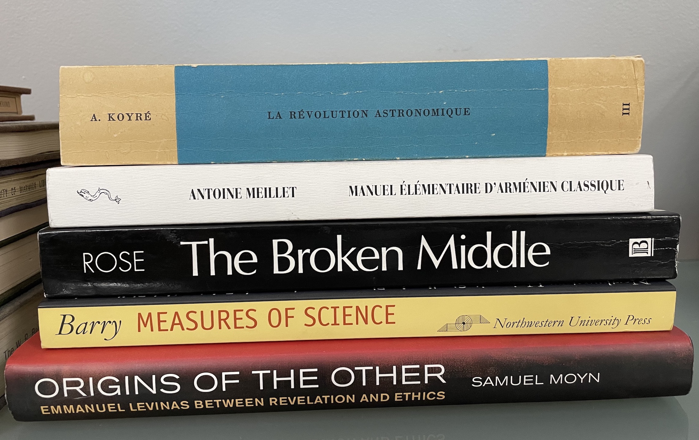 Some recently bought second-hand books, including Gillian Rose’s The Broken Middle, James Barry, Measures of Science, and Samuel Moyn, Origins of the Other: Emmanuel Levinas between Revelation and Ethics. Top of the pile is a first edition of Alexandre Koyré’s La Révolution astronomique, dedicated and initialled by Koyré himself – a lovely find.