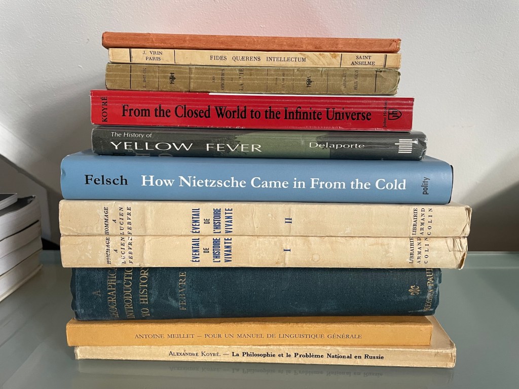 The second and third books are translations by Alexandre Koyré, and the top book is a copy of Georges Dumézil’s Ouranos-Varuna, an early book from 1934 that was difficult to find.