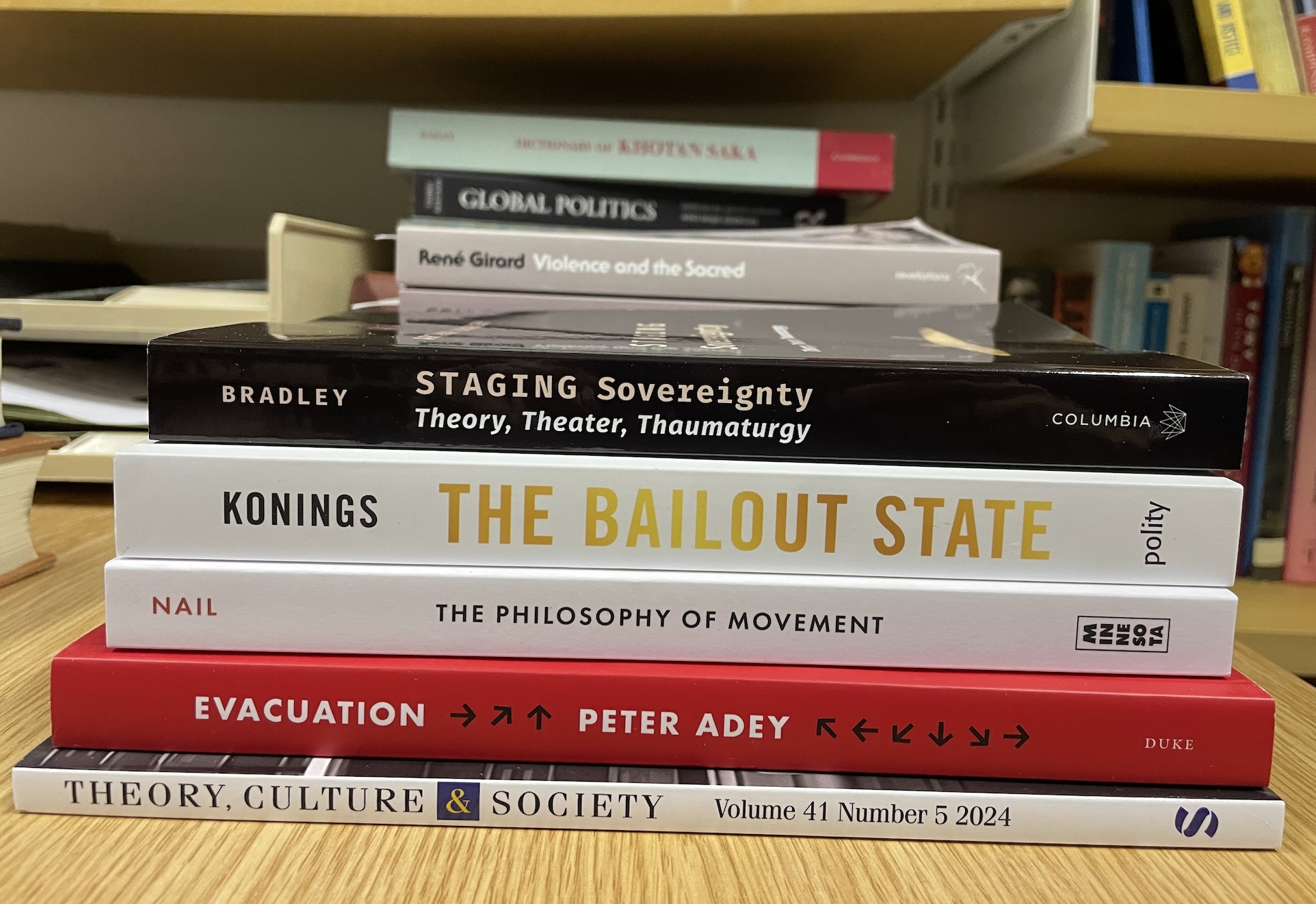 Some books previously mentioned here, sent by publishers – Arthur Bradley, Staging Sovereignty: Theory, Theater, Thaumaturgy; Martijn Konings, The Bailout State: Why Governments Rescue Banks, Not People; Thomas Nail, The Philosophy of Movement: An Introduction; Peter Adey, Evacuation: The Politics and Aesthetics of Movement in Emergency; and the theme issue of Theory, Culture & Society on ‘Thinking with Latour‘.