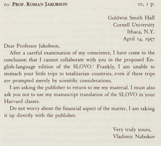 He had had a contract for years with the Bollingen Press for an annotated English edition of The Song of Igor’s Campaign to be prepared with Marc Szeftel and Roman Jakobson. All three contributors had been paid an advance. Although in no position to repay his share, Nabokov wanted to withdraw from the joint edition rather than work with Jakobson. To his delight, Bollingen agreed not to demand he return his part of the advance. He promptly wrote to Jakobson, explaining that he wanted to withdraw from their joint project on account of ‘your little trips to totalitarian countries.’ He had heard that the year before, in Moscow for a conference, Jakobson had wept at his return to the city, and had promised to come back soon. Nabokov was in fact convinced that Jakobson was a Communist agent. At a time when university faculties were hostile to the search for Communists on their campuses, Nabokov befriended the FBI agent assigned to Cornell and declared he would be proud to have his son join the FBI in that role. No wonder it was impossible for him to work alongside Jakobson (p. 311; the letter is from 14 April 1957).
