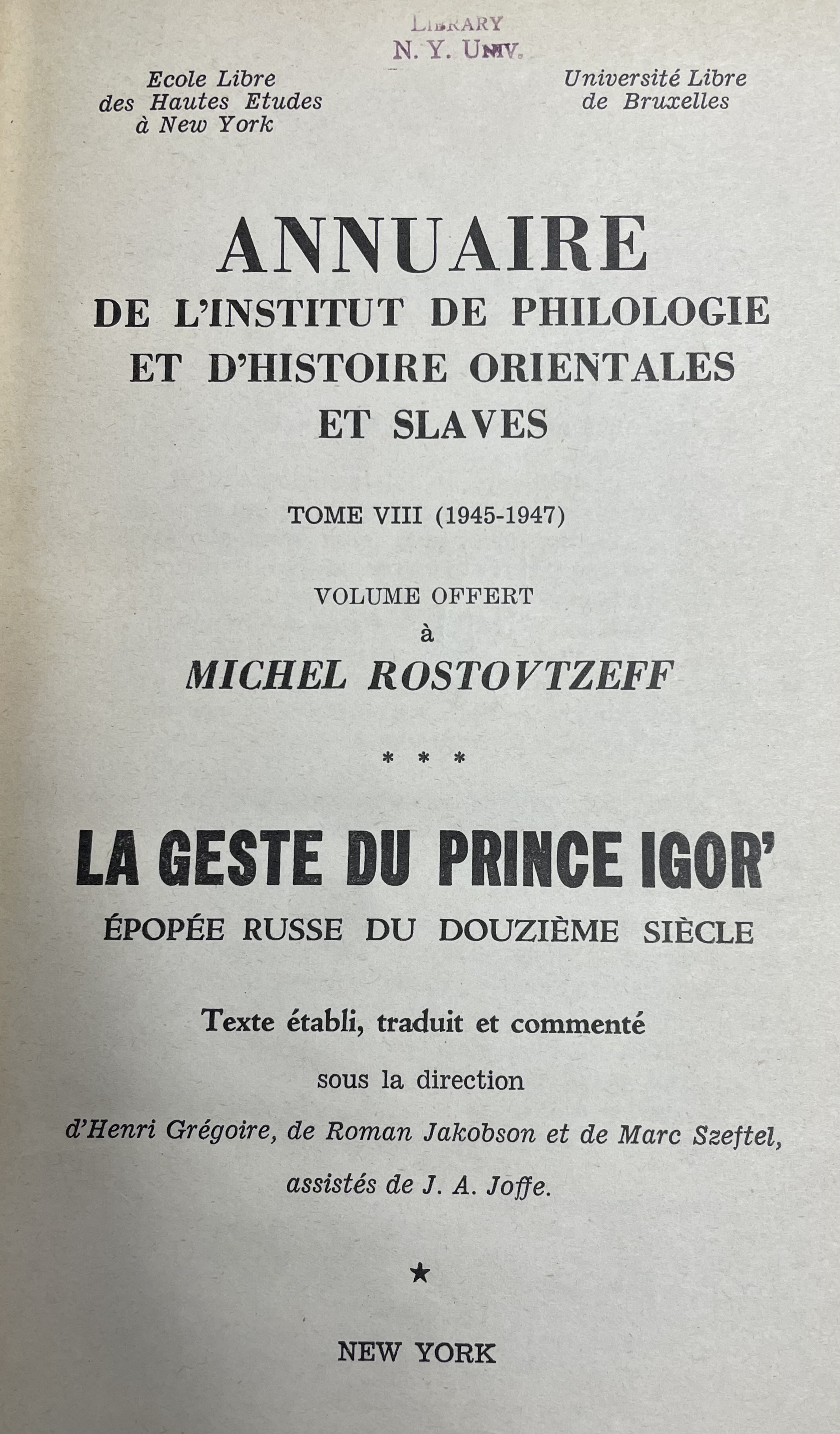 Nabokov of course learned of this opposition through mutual friends, and the acrimony was doubtless part of the reason for a failed collaboration between the two of them on an English translation of “The Song of Igor”. This was a Russian poem, alternatively known as “The Tale of Igor’s Campaign” or other variants. It dated from probably from the late 12th century or the early 13th, and was written in Old East Slavic. Jakobson had worked on a critical edition of the text with Henri Grégoire and Szeftel as La Geste du Prince Igor’, published in 1948. Though appearing with Columbia University Press, the essays and apparatus in the book were in French: this was a collaboration between scholars who had met at the ELHE, and the text was formally volume 8 of the Annuaire de l’Institut de philologie et d’histoire orientales et slaves. (A collaborative course on the text had been taught at the ELHE in 1942-43, with others involved, including Alexandre Koyré.) While the volume also included French and English translations, Jakobson’s contribution was the edition of the text, a modern Russian translation and an essay on the authenticity of the text. His parts are reprinted in his Selected Writings Volume IV.