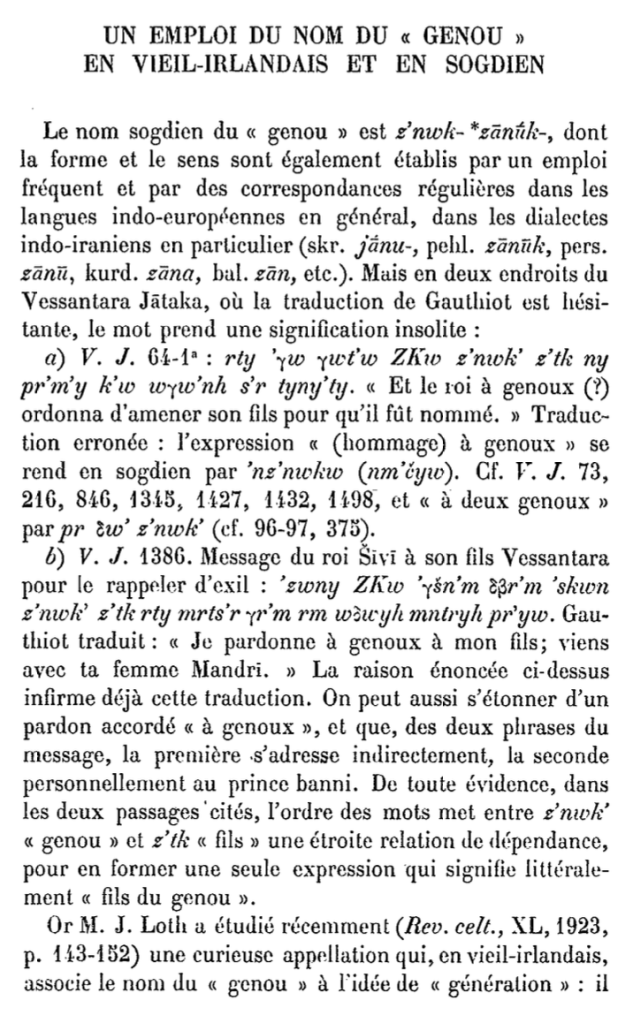 One of Benveniste’s very earliest publications, in 1926, when he was in his early 20s, is on a question of Sogdian vocabulary. It was his second short article in the Bulletin de la Société de Linguistique de Paris; a journal in which he would publish much of his work and later edit. It is on the word for ‘knee [genou]’, z’nwk- *zānūk, and he says its sense in Sogdian texts is usually clear from context, or in relation to Indo-European languages generally, and to Indo-Iranian in particular.