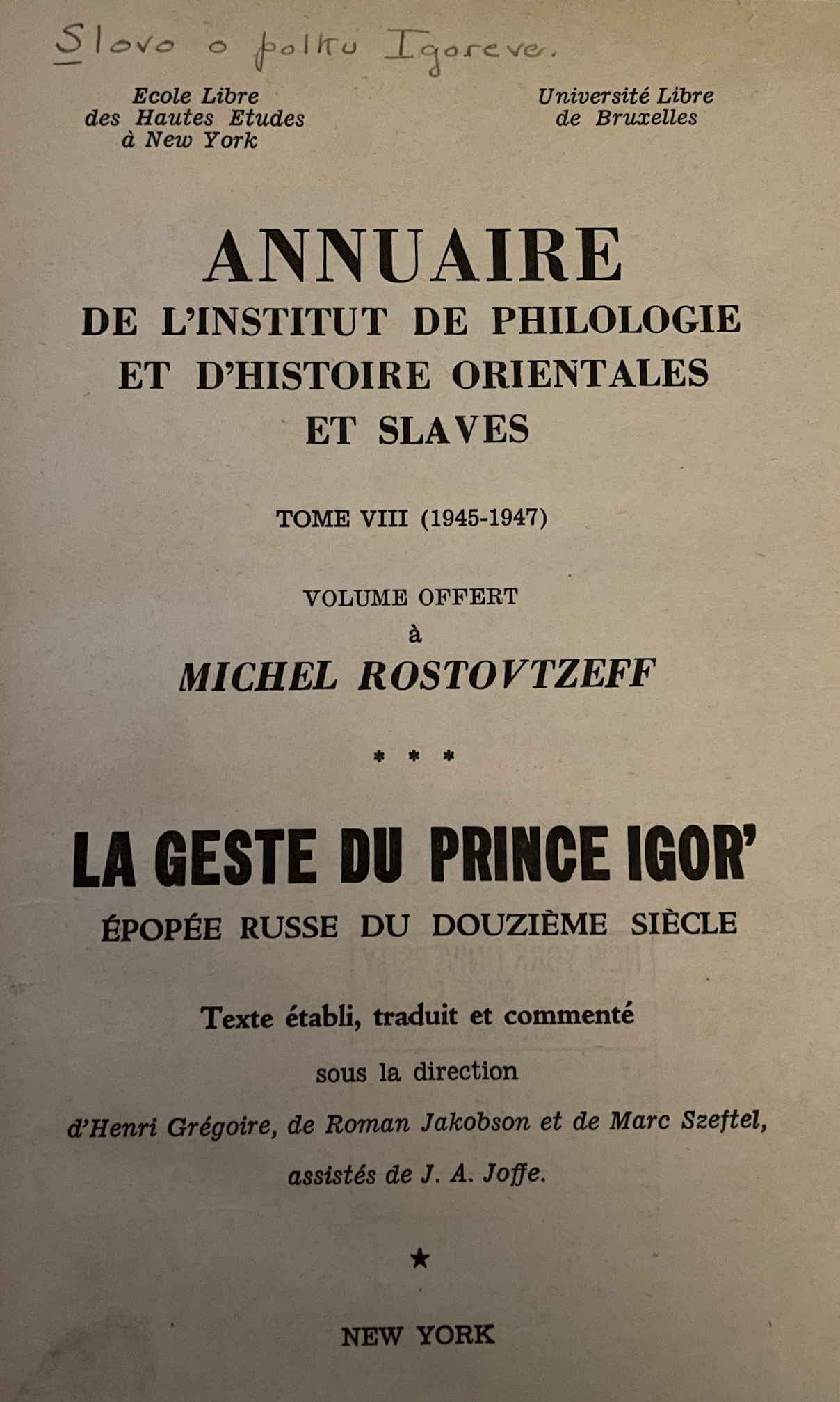 The course directly led to the collaborative volume La Geste du Prince Igor’ in 1948, though not all those participating in the teaching were involved with that. Koyré’s involvement, in particular, seems to have ended with the seminar. The named editors of the book were Grégoire, Jakobson and Szeftel, with the assistance of J.A. Joffe. Jakobson and Grégoire’s seminar feud had clearly been overcome, at least temporarily, with Grégoire’s contribution to the volume a French translation of the tale. (In 1946, Jakobson also wrote a laudatory piece about Grégoire for Byzantina Metabyzantina, which was reprinted in Le Flambeau – a journal Grégoire co-edited – after Grégoire’s death in 1964.) Jakobson contributes by far the most material, including a critical edition and reconstruction of the text, a long essay on its authenticity and notes. He also edited Samuel H. Cross’s English translation for the volume. Szeftel and Vernadsky provide historical contextualisation.