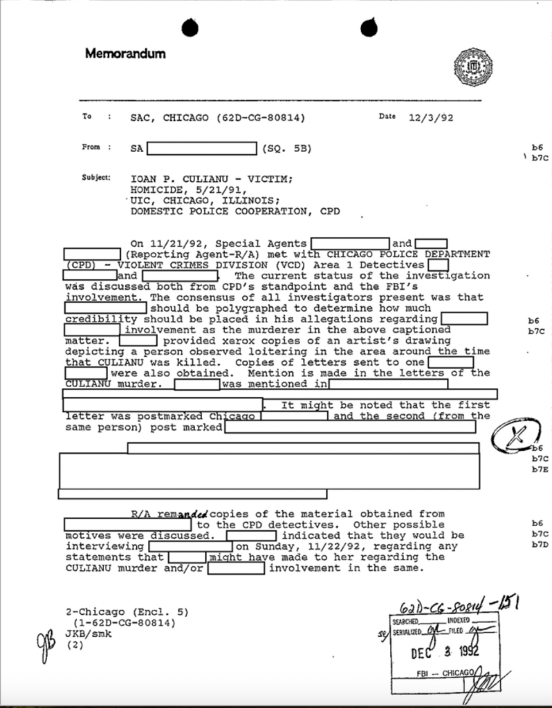 For those wanting to follow in Anton and Lincoln’s footsteps, the FBI files on Culianu are partly available online. The FBI vault website lists three files, of 489, 324 and 227 pages, although the second and third appear to be entirely blank if you download them, though can be read online. As with other FBI files I’ve seen, there is a lot of repetition, several coversheets and pro forma, newsclippings, and much is redacted.