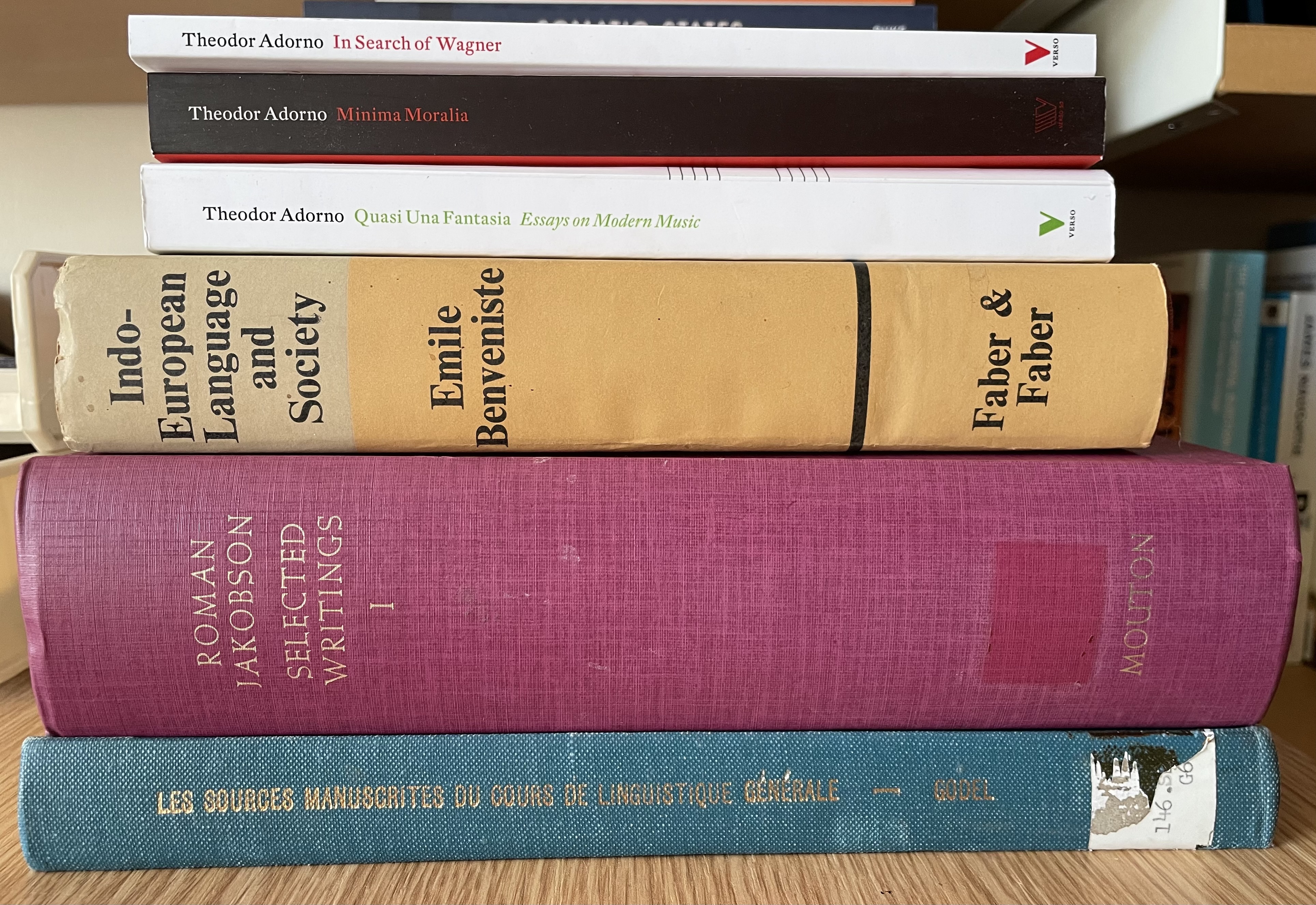 Three books by Adorno from Verso, and second-hand copies of Émile Benveniste’s Indo-European Language and Society, the first volume of Roman Jakobson’s Selected Writings, and Robert Godel, Les Sources Manuscrites du cours de linguistique générale de F. de Saussure.